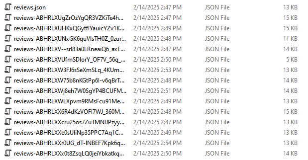 Scroll through the many files until you find the reviews.json files. There may be additional review files, as seen below.