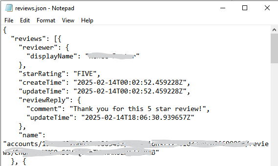 In the example below, “displayName” is the person who left the review of 5 stars on February 14, 2025. They did not leave a written review, just a star rating. The business owner replied, “Thank you for this 5 star review!