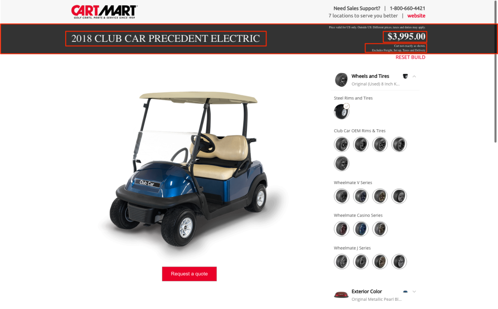 Some of the highlights include a custom full-width, headerbar area that clearly defined the configurator itself from the navbar/menu at the top. It created a really nice container for the golf cart and its options. It also featured the price, the name of the model selected, and some disclaimers about taxes, freight, and more all in one easy to view and rear place. See highlights in red below in the screenshot.
