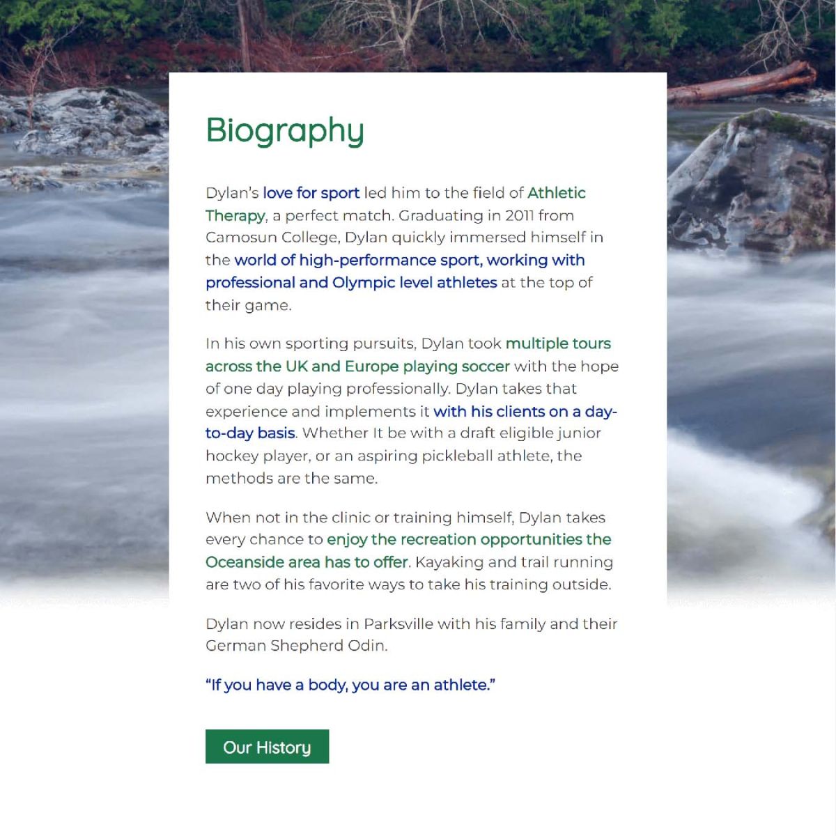 Dylan’s new website brings his “upstream” philosophy to life with a vibrant blue-green palette, local landscapes, and intuitive navigation. SEO-optimized pages and clear service paths make it easy for families, athletes, and industry teams to discover and book his injury rehabilitation, performance training, and workplace wellness offerings.